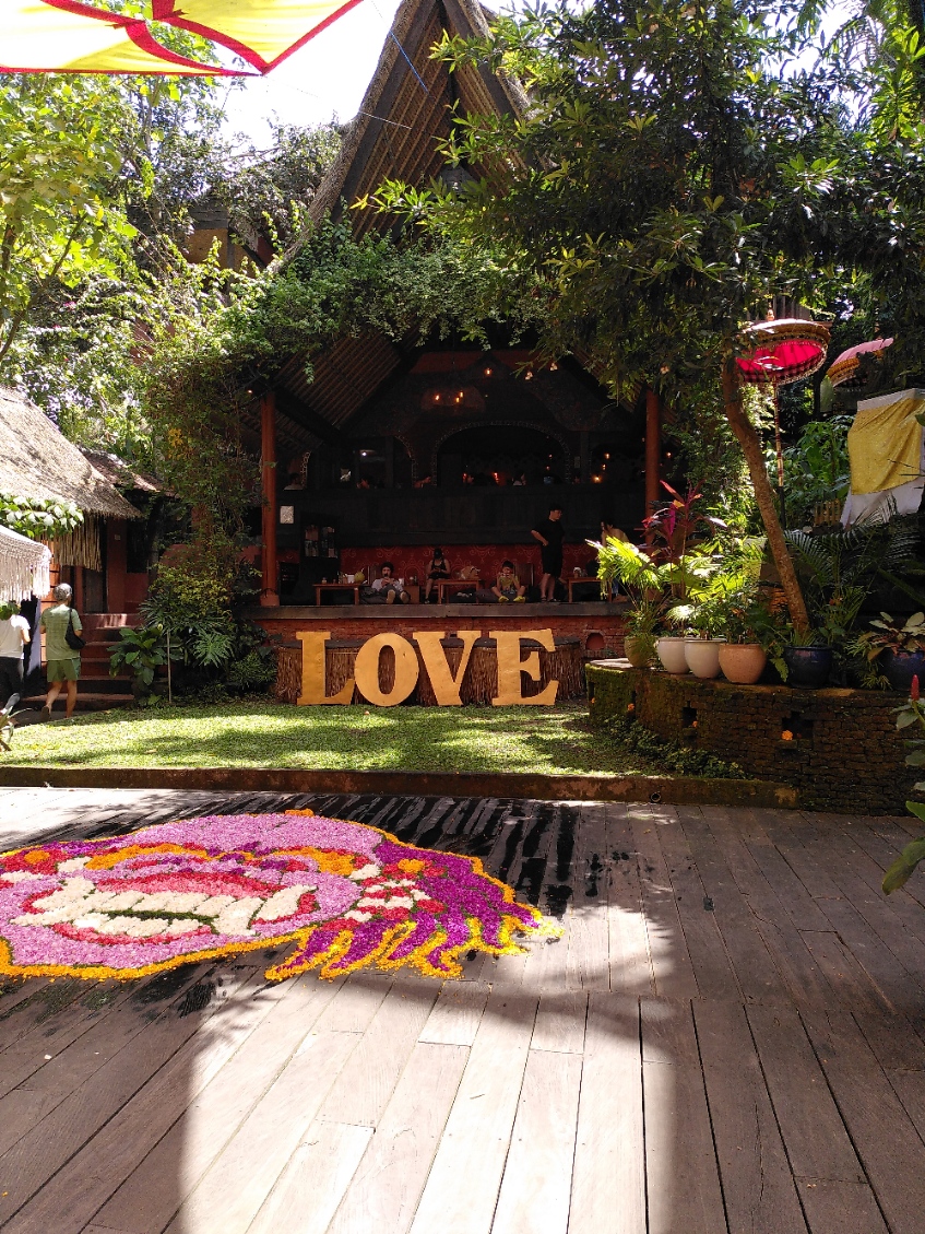 Ich habe spontan an einer Yogastunde meiner Ausbilderin teilgenommen, die zusätzlich im „yogabarn“ in Ubud unterrichtet. Spontan bedeutet in diesem Falle, dass ich mir das Studio an meinem ersten Tag einfach anschauen wollte, mich dann doch für eine Einheit entschieden sowie in 10 Minuten neue Yogaklamotten gekauft und mich angemeldet habe. Bei dieser Yogaschule handelt es sich nicht nur um ein Studio, es ist ein ganzes Dorf! Gefühlte 100 Studios, ein Spa, ein Restaurant und Café, Hotel und Shop sowie unglaublich viele „Yoga-Verrückte“ sind dort zu finden. 🙂