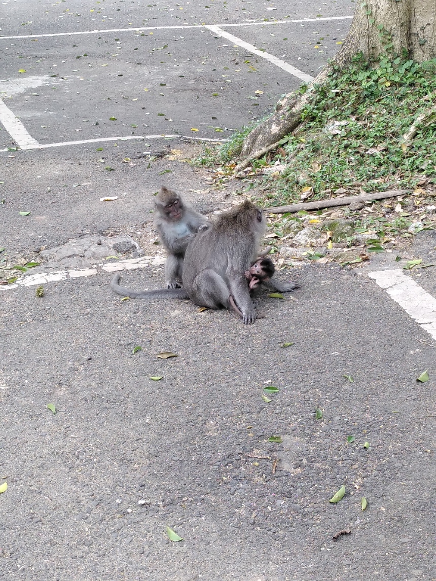 Am nächsten Morgen habe ich mich erneut auf den Weg ins „yogabarn“ gemacht, um mit Charlotte gemeinsam eine weitere Yogastunde unserer Ausbilderin zu besuchen. Auf dem Weg dorthin habe ich mich allerdings verlaufen… Zu meinem Glück, denn plötzlich stand ich direkt vor dem Eingang des „Monkey Forest“. Da die Affen sich nicht um die Grenzen des Parkes kümmern, haben sie die komplette Umgebung bevölkert, sodass ich ohne weitere Bemühungen zuckersüße Affenbabys und verspielte Teenie-Affen beobachten konnte.
