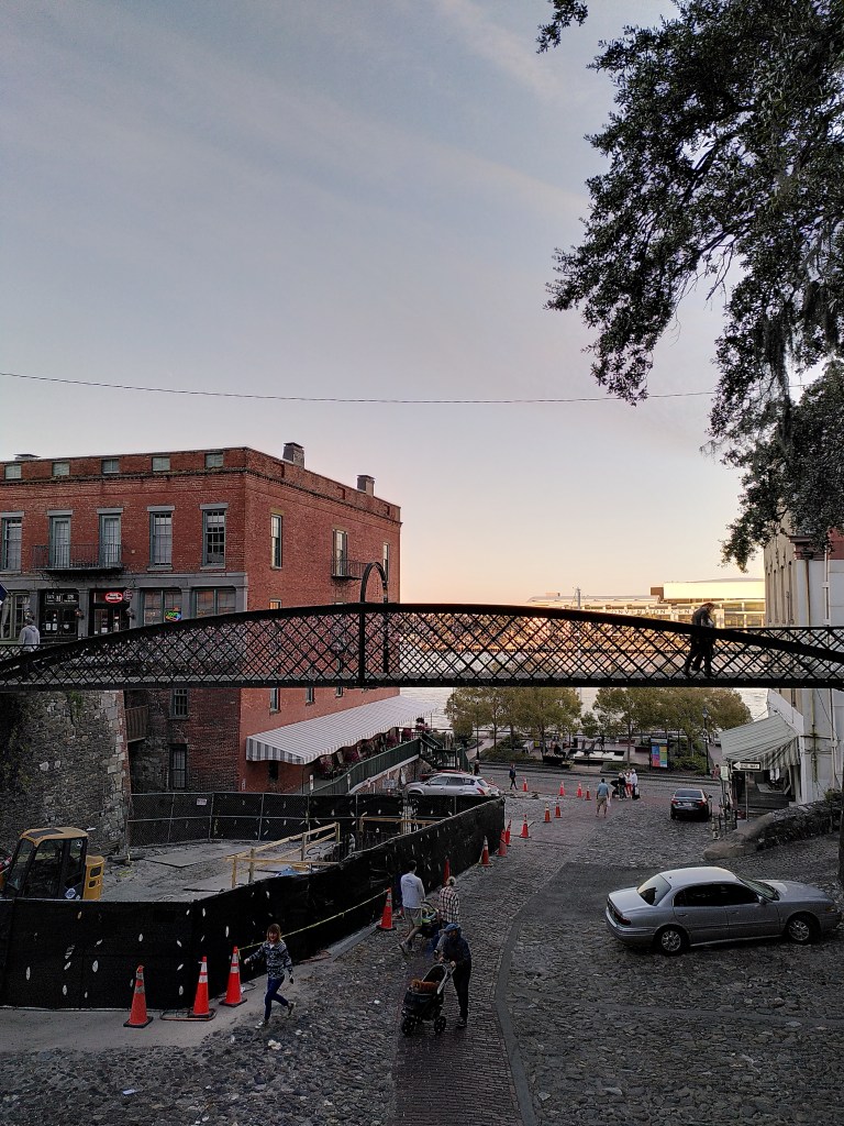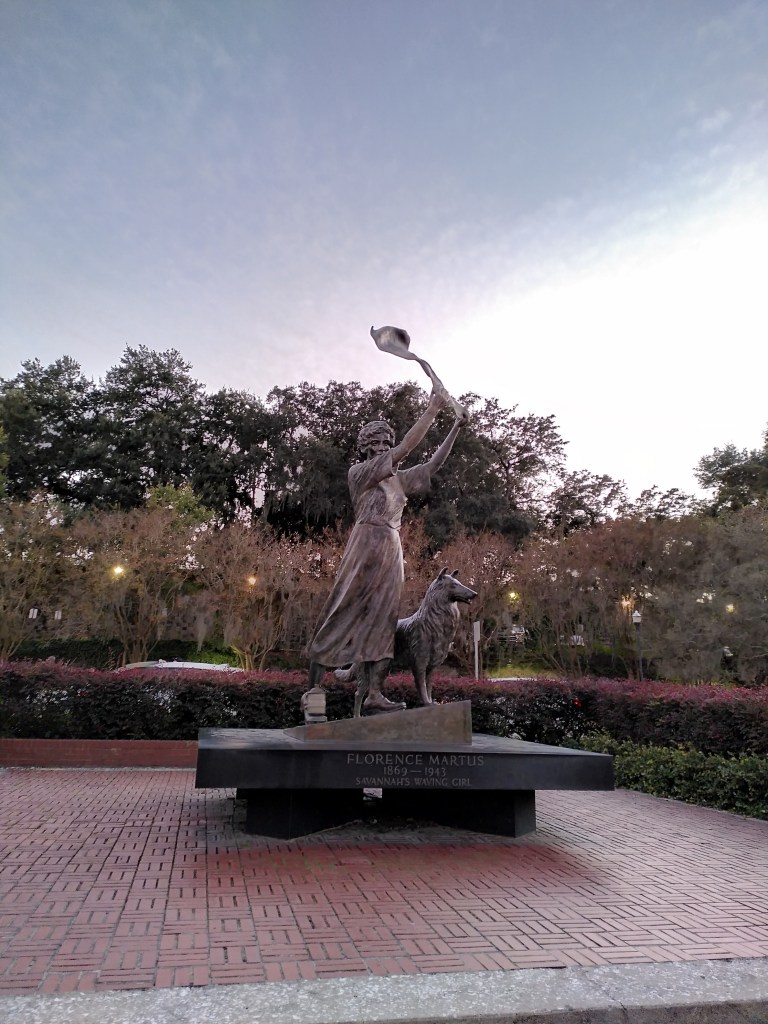Zum Sonnenuntergang spazierten wir am Savannah River entlang und besuchten die Statue des winkenden Mädchens am Hafen, dass vorbeifahrende Schiffe und Passanten grüßt.