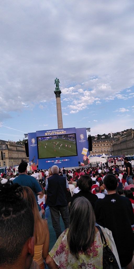 Zum Mittagessen mache ich mich wieder auf den Weg in die Fanzone am Schlossplatz. Mit leckerem Essen in den Händen mache ich es mir mit ein paar anderen Volunteers im Schatten auf dem Karlsplatz gemütlich. Auch wenn sich die Stadt füllt, bleibt der Karlsplatz ein entspannter und ruhiger Rückzugsort. 🙂