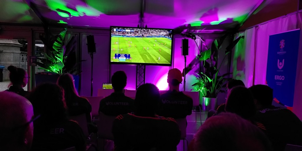Mit einem Eis in der Hand mache ich es mir anschließend mit einigen aus der Gruppe im Hub auf dem Karlsplatz zum „Volunteer Viewing“ bequem. Leider ist die Übertragung auf dem Schlossplatz schneller als der Streamingdienst unseres Vertrauens, sodass wir die ersten Reaktionen auf das Spielgeschehen immer schon hören, bevor auf dem Bildschirm etwas zu sehen ist…