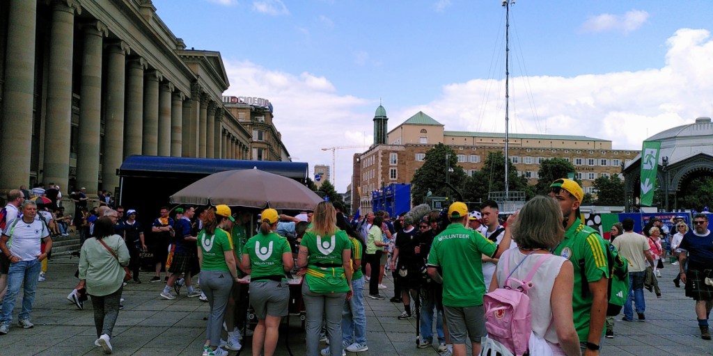 Aufgrund der Brisanz des Spiels, welches die Schotten und Ungarn in der Stuttgart Arena austragen, und der zeitgleichen Übertragung des Spiels Schweiz vs. Deutschland auf dem Schlossplatz, beginne ich meine Schicht etwas früher.