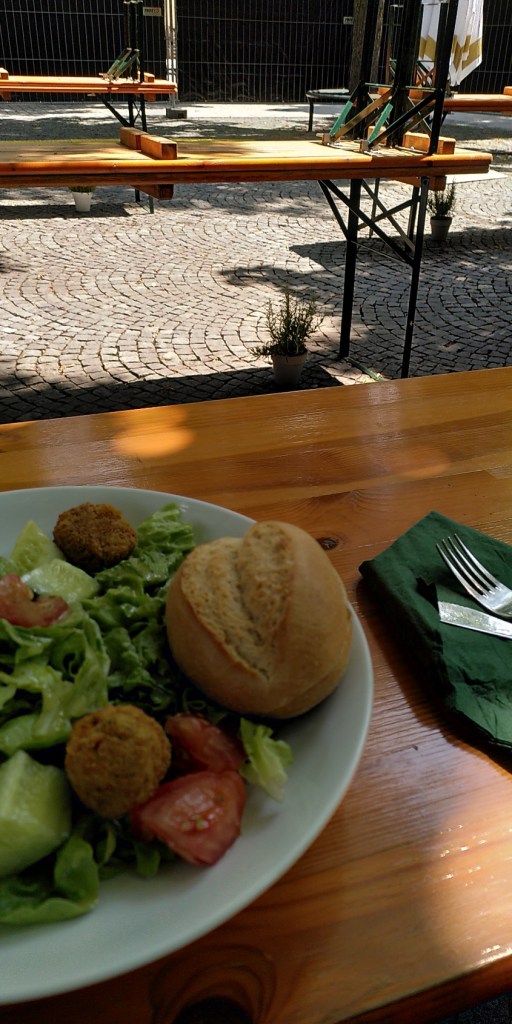 Um 12 Uhr richteten wir die Matten auf dem Karlsplatz zurecht, sodass ich eine Viertelstunde später mit der Stunde beginnen konnte. Eine weitere Viertelstunde später wurde ich von den Organisatorinnen der Kulturbühne zu einem jähen Ende gebeten. Der Ordnungsdient hatte die Weisung erhalten, das gesamte Gelände aufgrund einer Wetterwarnung zu räumen.